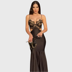 Seja o centro das atenções com este cativante vestido de festa em cetim, concebido para combinar elegância e sedução. As finas alças finas e o corpete de renda acrescentam um toque de romance, enquanto os recortes na cintura esculpem a silhueta com uma ousadia refinada. A silhueta sereia, que desce até ao chão, acompanha cada passo com graciosidade e movimento fluido. Um vestido que transforma cada ocasião num momento memorável.