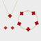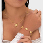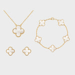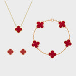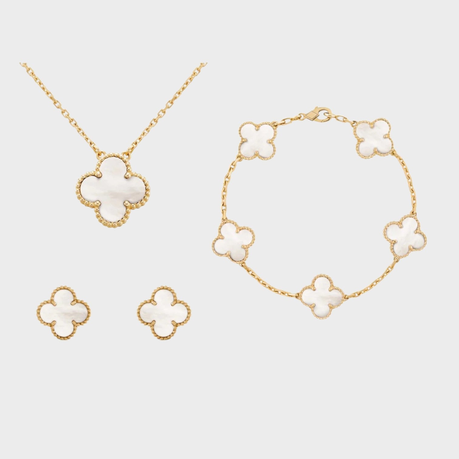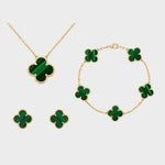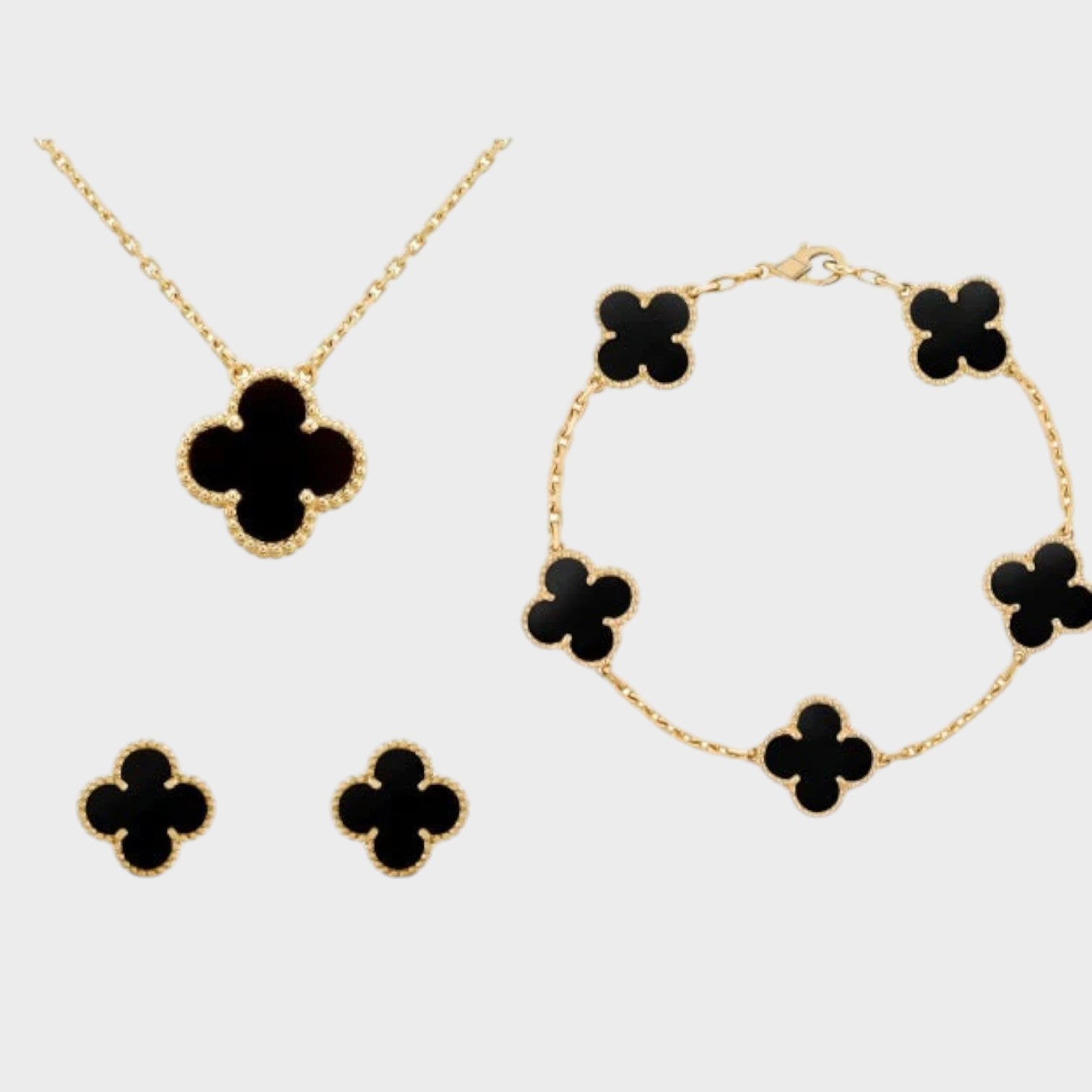 Este conjunto de joias com trevo-de-quatro-folhas, que inclui um colar, uma pulseira e uns brincos, é a combinação perfeita de sofisticação e charme. Os intrincados motivos de trevo simbolizam sorte e beleza, acrescentando um toque requintado e cheio de significado ao seu visual. Usado em conjunto ou em separado, este conjunto confere elegância a qualquer look.