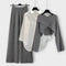 Desenhado com versatilidade em mente, este conjunto inclui uma blusa solta, um suéter cropped moderno e calças de perna larga, tornando-o ideal para criar um look relaxado e ao mesmo tempo elegante.