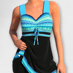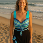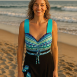 Nem toda mulher se sente confortável em maiôs justos ou biquínis cavados – e está tudo bem. Este conjunto de duas peças com saia foi criado para quem gosta de se sentir livre, estilosa e bem coberta. O top oferece sustentação sem aro e a saia cai solta sobre as coxas. Ideal para quem prefere não exibir tanto a barriga ou as pernas, mas ainda assim quer brilhar à beira da água.
