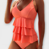 • Folhos favorecedores que disfarçam a barriga: As camadas suaves camuflam subtilmente a barriga e criam uma silhueta divertida, fazendo-a sentir-se confortável e confiante sem apertar.