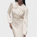 Este vestido longo de manga longa é a definição de sofisticação moderna. Com um caimento impecável e drapeado estratégico na região do busto, ele valoriza a silhueta de forma sutil e refinada. Ideal para eventos formais, jantares ou ocasiões especiais, essa peça transmite elegância sem esforço, garantindo presença marcante e atemporal.