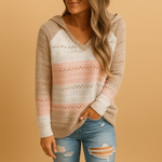Descubra o pullover Loïs, uma peça essencial que une conforto, estilo e liberdade de movimento. Com um decote em V clássico e detalhes de malha aberta, é a escolha perfeita para sobreposições em primavera, verão ou outono.