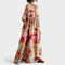Este vestido maxi boémio celebra a alegria dos pequenos detalhes: cada círculo colorido — em tons de laranja, vermelho, fúcsia e turquesa — traz vida ao tecido leve, enquanto a silhueta fluida e o decote em V acentuam o seu espírito livre. As mangas amplas em estilo morcego e os bolsos laterais escondem a praticidade sob um toque artístico, permitindo-lhe dançar entre o quotidiano e as ocasiões especiais com um sorriso de confiança.