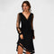 Deslumbre em qualquer ocasião com este vestido preto sofisticado, que combina perfeitamente classe e um toque de ousadia. Com decote em V e mangas longas transparentes com detalhes cintilantes, esta peça transmite charme e feminilidade de forma sutil e refinada.