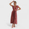 Deixe-se envolver pelo charme intemporal deste vestido midi plissado em tom terracota. O seu decote profundo em V e a cintura marcada criam uma silhueta feminina e sofisticada, enquanto o tecido fluido acompanha os seus passos com leveza. Ideal para casamentos, jantares especiais ou eventos formais, este vestido é a escolha perfeita para quem quer brilhar com classe e confiança.