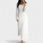 Este vestido longo de malha é a escolha ideal para quem procura um look sofisticado com um toque moderno e confortável. O corte justo realça delicadamente a silhueta, enquanto o tecido canelado oferece elasticidade e um caimento perfeito. Com mangas compridas e um design intemporal, adapta-se facilmente do dia para a noite — basta mudar os acessórios.